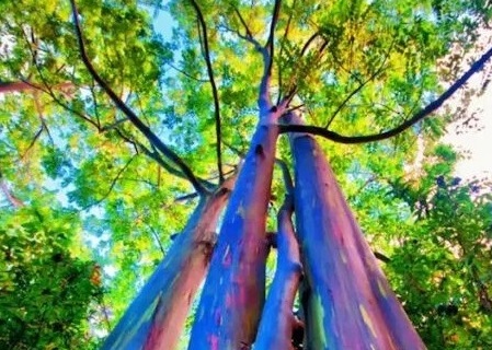 Es un verdadero show para la vista pasear por los bosques del eucalipto arcoíris. Como indica su nombre, sus ramas adoptan distintos tonos a medida que los parches del exterior de la corteza se van cayendo en diferentes momento, mostrando una corteza interior de color verde brillante, que al oscurecer y madurar queda azul, púrpura, naranja y eventualmente granate.